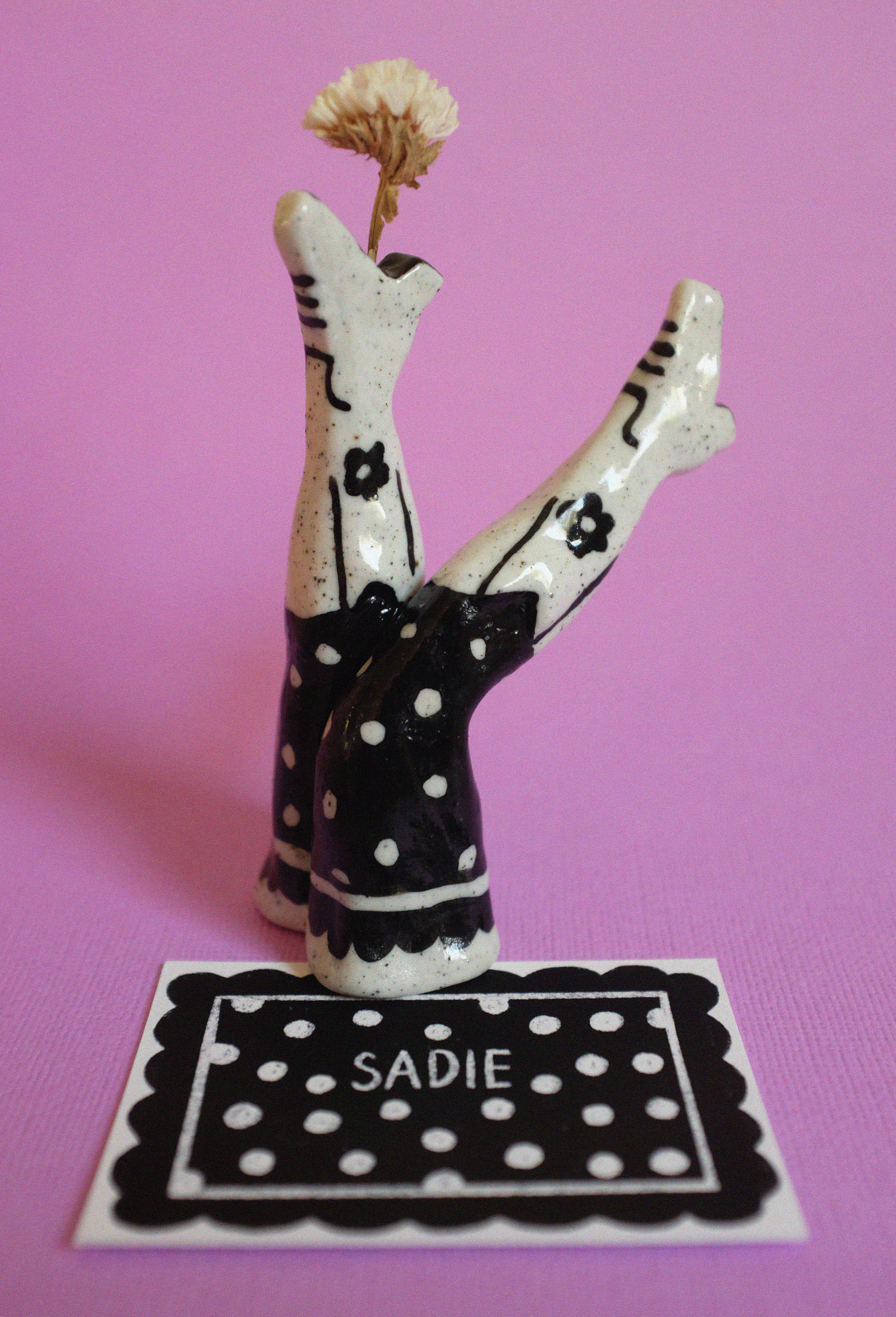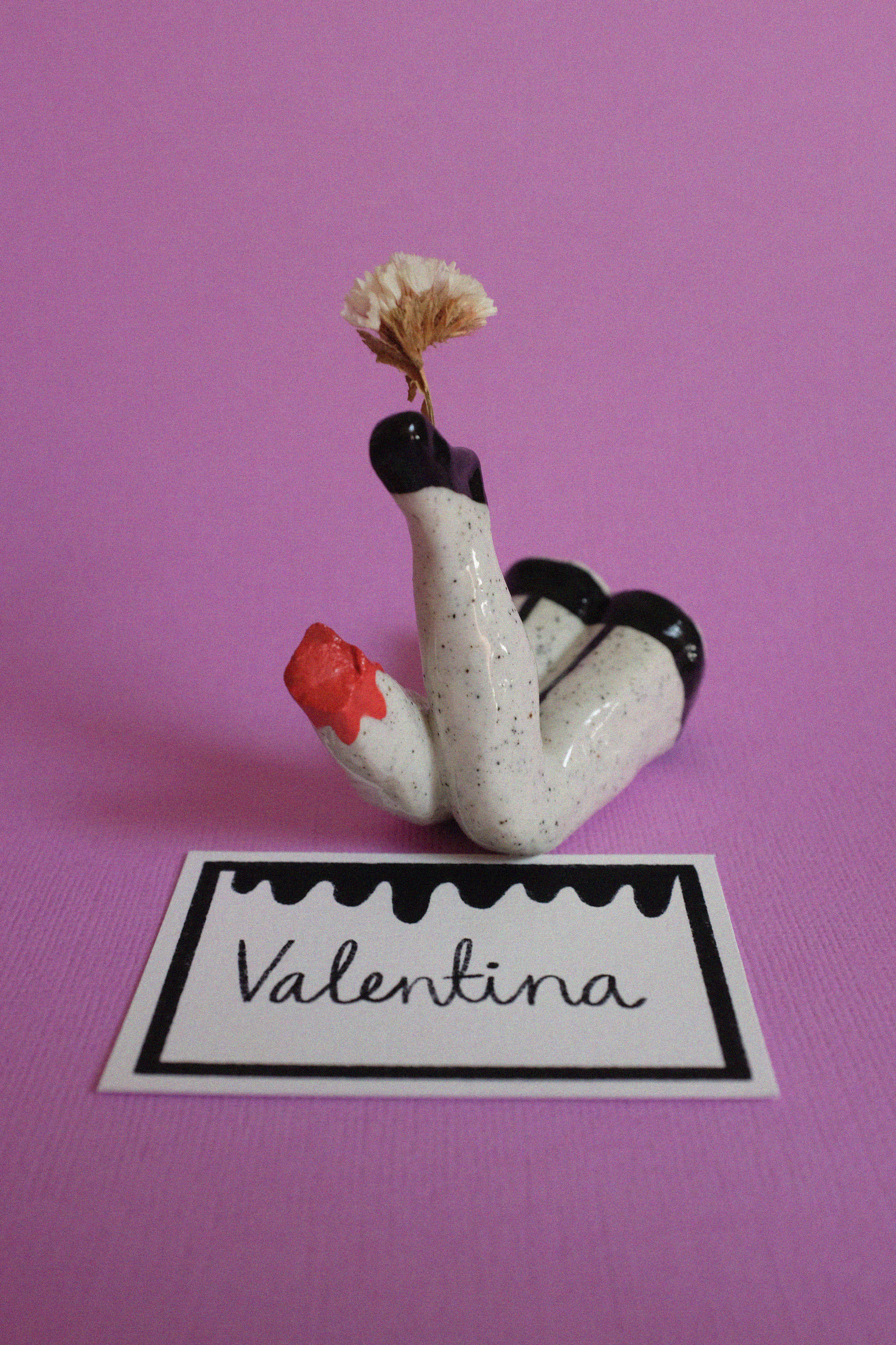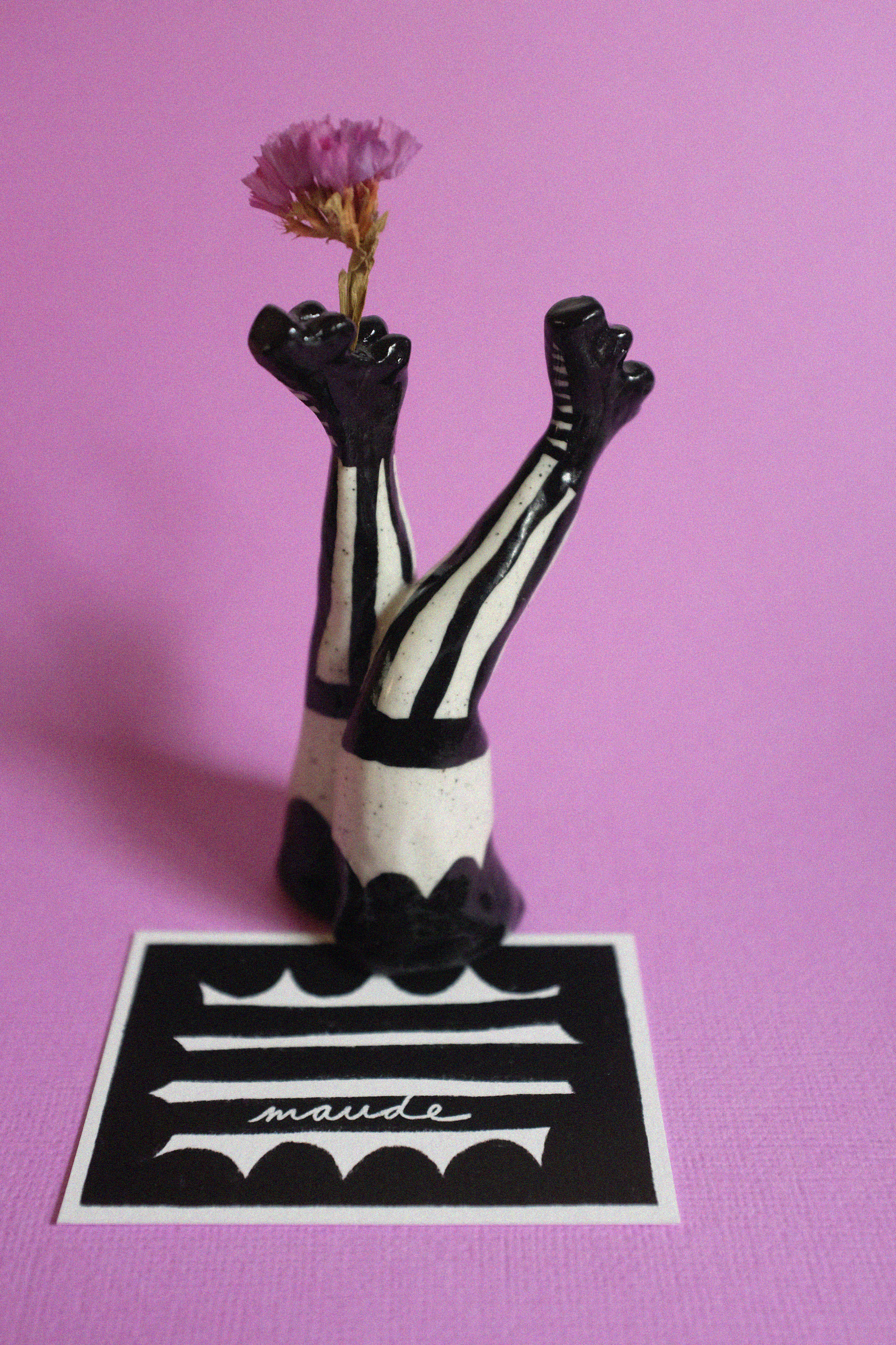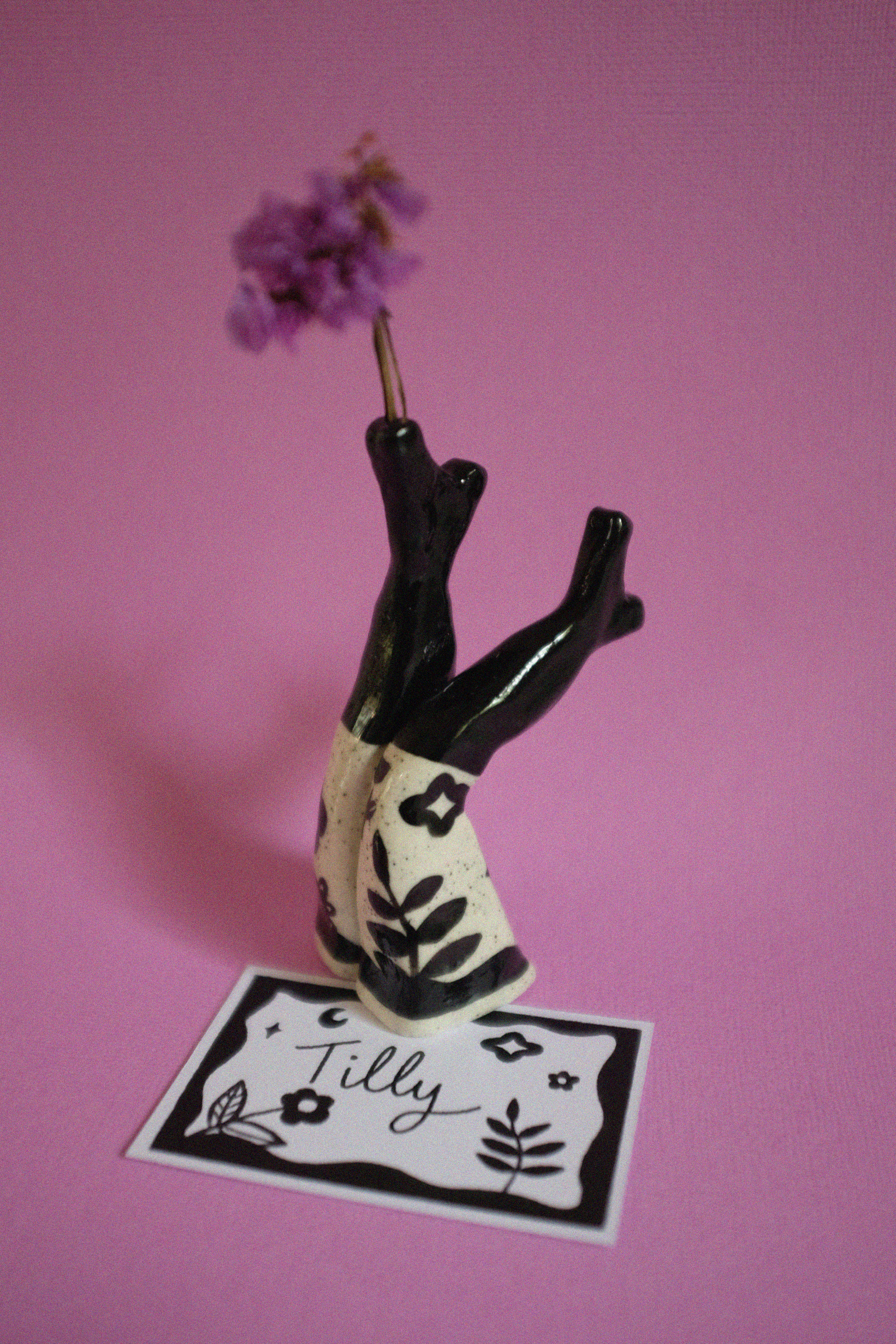 These ceramic leg bud vases are functional artworks, hand sculpted from stoneware clay and hand painted with unique designs inspired by flowers, tattoos, and stockings. They can hold a single bloom, incense, or jewellery, or simply exist as beautiful sculptural objects. Every pair of legs is one of a kind, has its own name, and comes with an illustrated name card, making each piece a small, collectible character.