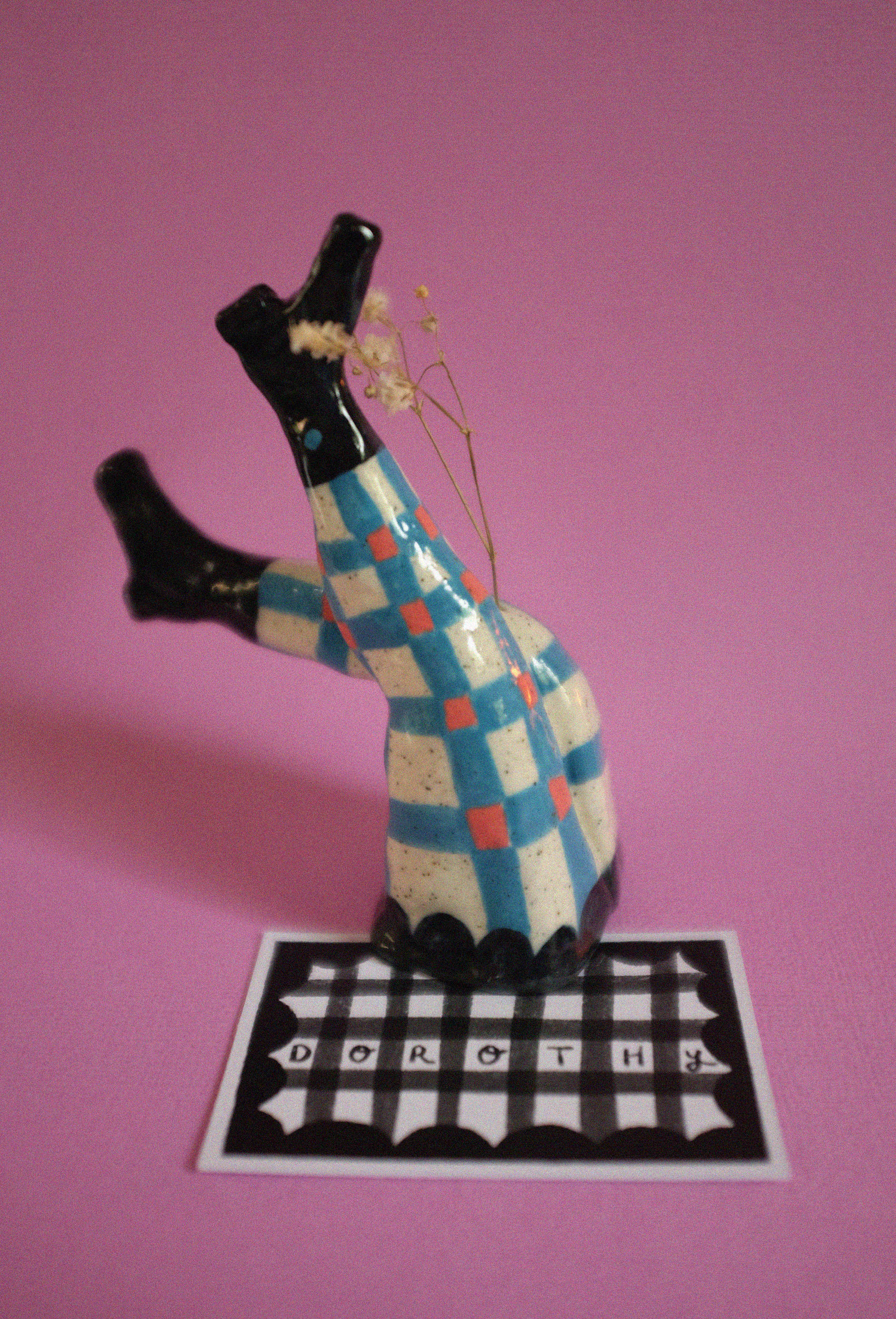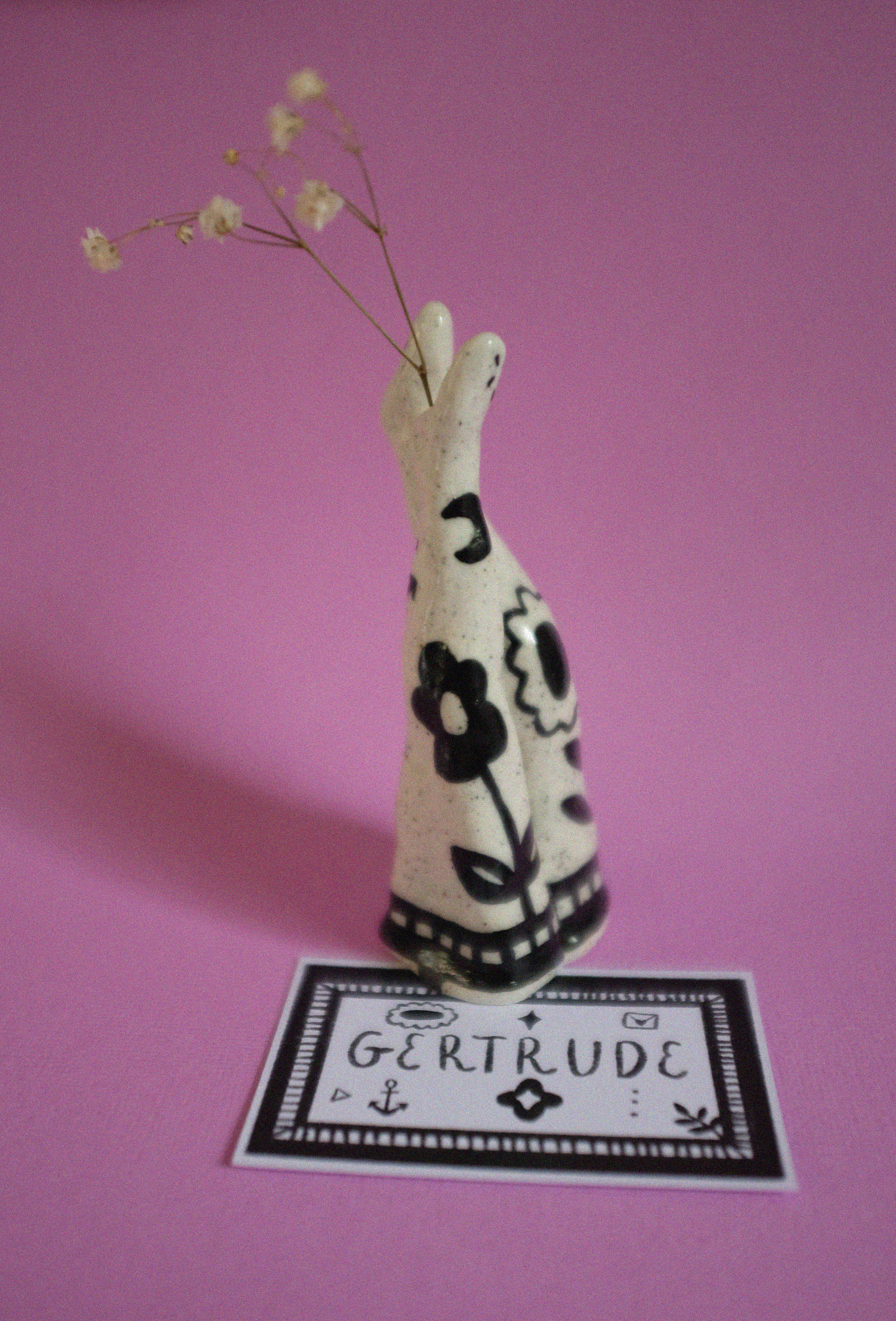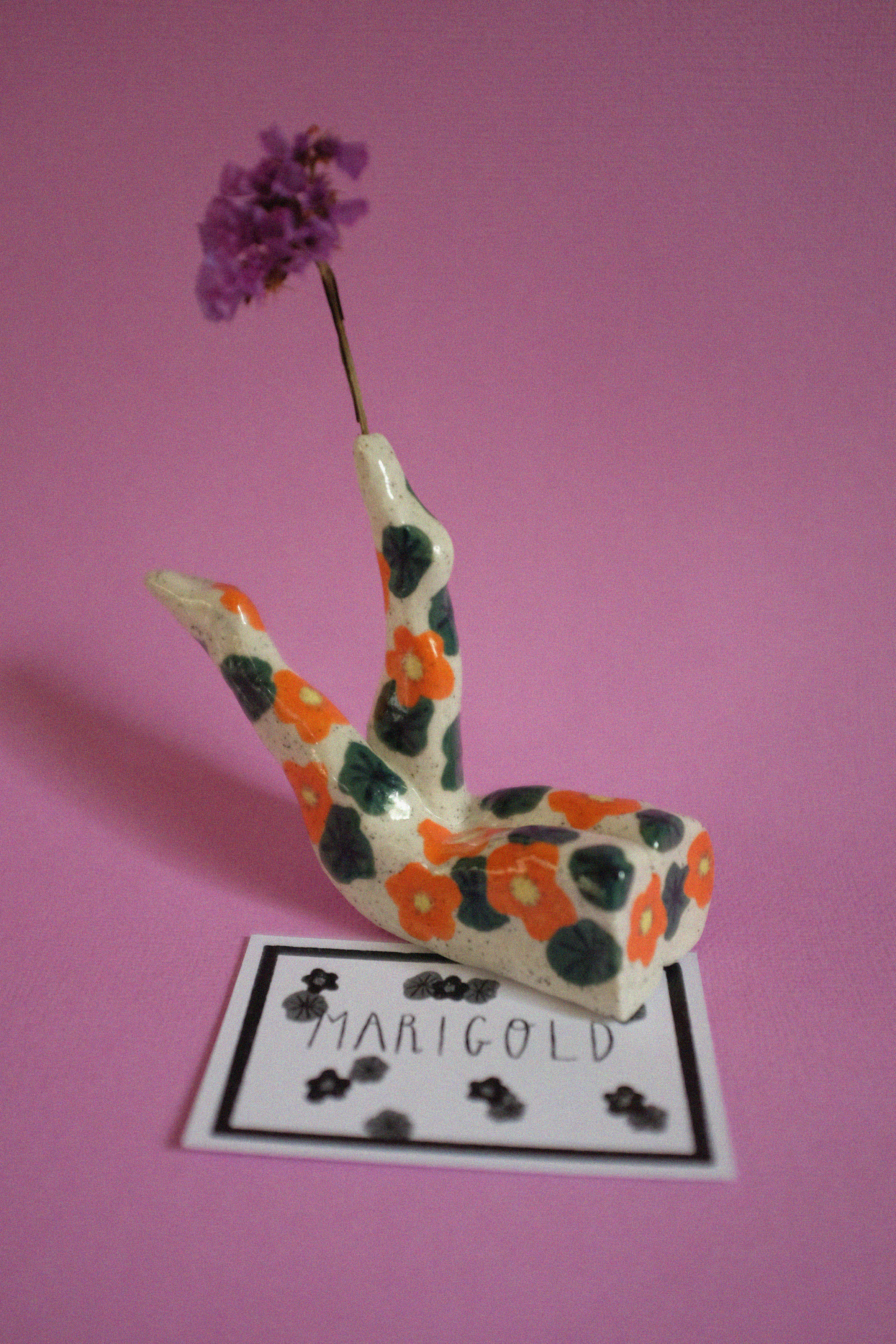 These ceramic leg bud vases are functional artworks, hand sculpted from stoneware clay and hand painted with unique designs inspired by flowers, tattoos, and stockings. They can hold a single bloom, incense, or jewellery, or simply exist as beautiful sculptural objects. Every pair of legs is one of a kind, has its own name, and comes with an illustrated name card, making each piece a small, collectible character.